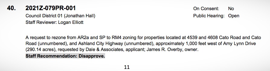 The Commission could still approve it anyway, and regardless of Planning Staff’s recommendation, and/or the Planning Commission’s vote, Councilman Hall could still introduce legislation to rezone. So we’re not out of the woods yet.